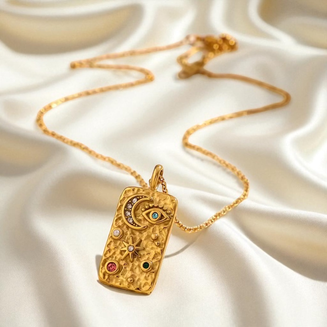 Unlock cosmic energy and protection with our stunning Celestial Eye Necklace Pendant. This delicately crafted pendant features powerful symbols—a radiant star, a crescent moon, and the protective evil eye—bringing you balance, intuition, and positive vibes wherever you go.