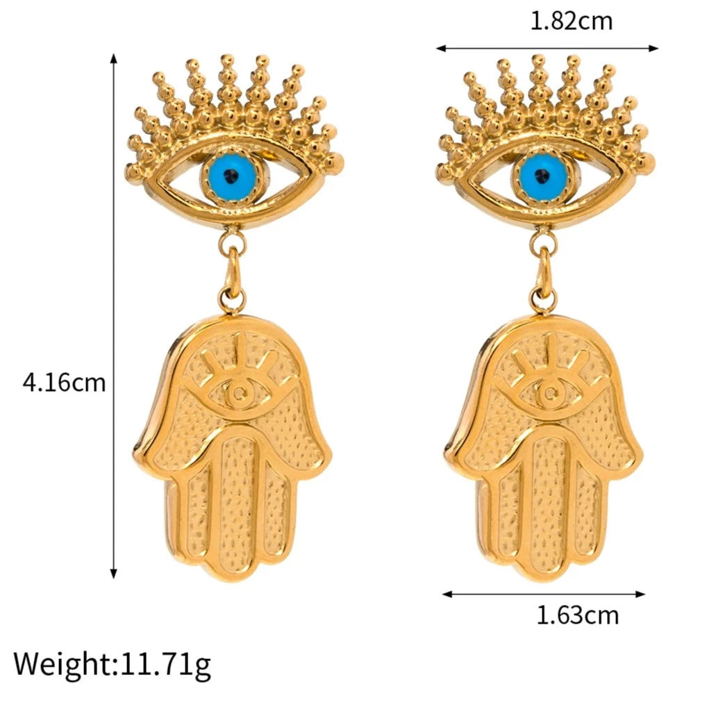 These earrings seamlessly blend style and protection. The intricate Evil Eye and Hamsa Hand designs are adorned with utmost care and crafted to remain tarnish-free, ensuring enduring elegance.