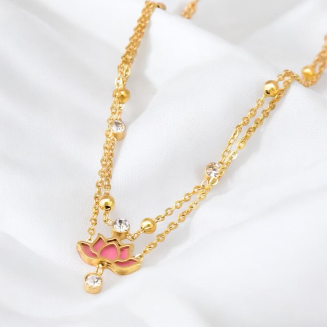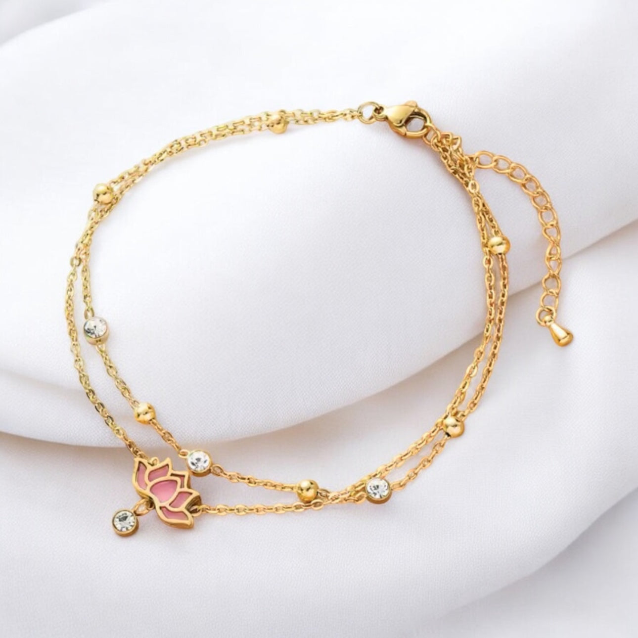 Introducing our Pink Lotus Anklet – a masterpiece of style and spirituality. The lotus flower, a profound symbol of enlightenment and rebirth, graces this anklet, making it a wearable emblem of transformation.