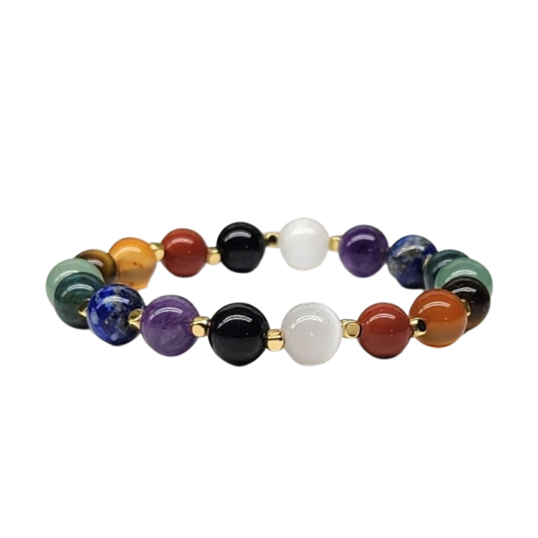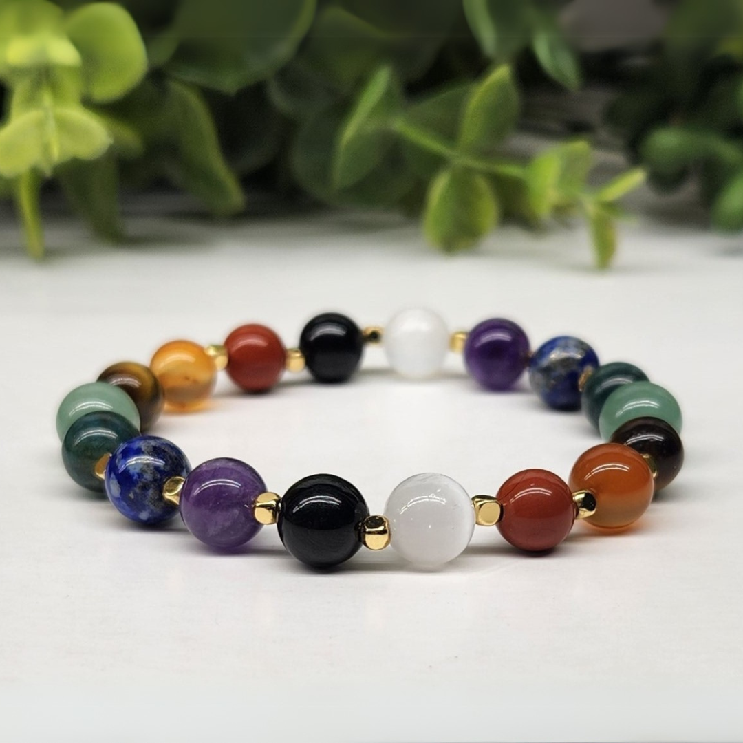 The Seven Chakra Crystal Bracelet is thoughtfully designed to align and balance your chakras while providing extra layers of protection and cleansing. Featuring a combination of chakra-aligned gemstones and powerful protective stones, this bracelet offers a holistic approach to spiritual well-being, harmony, and strength.