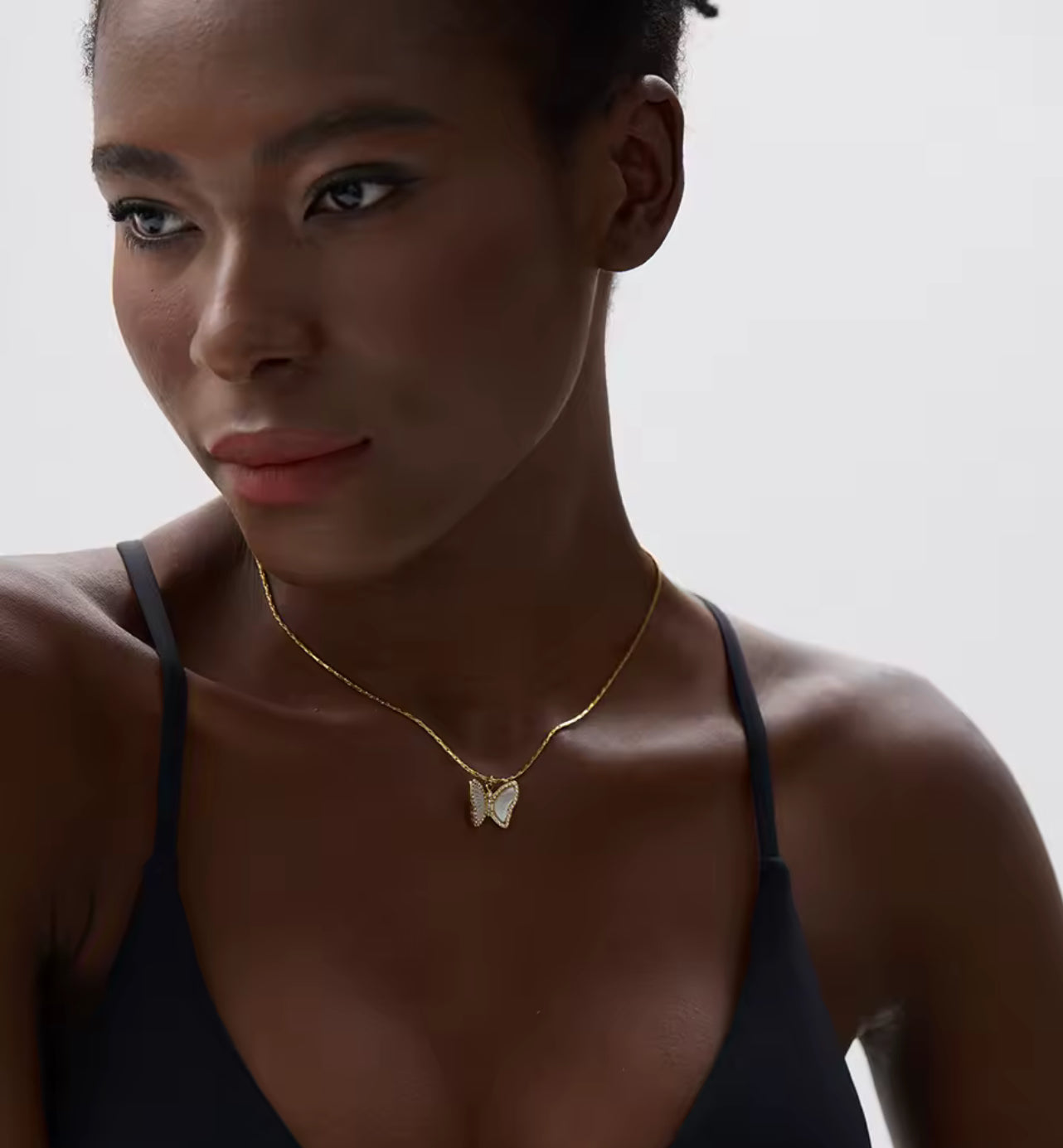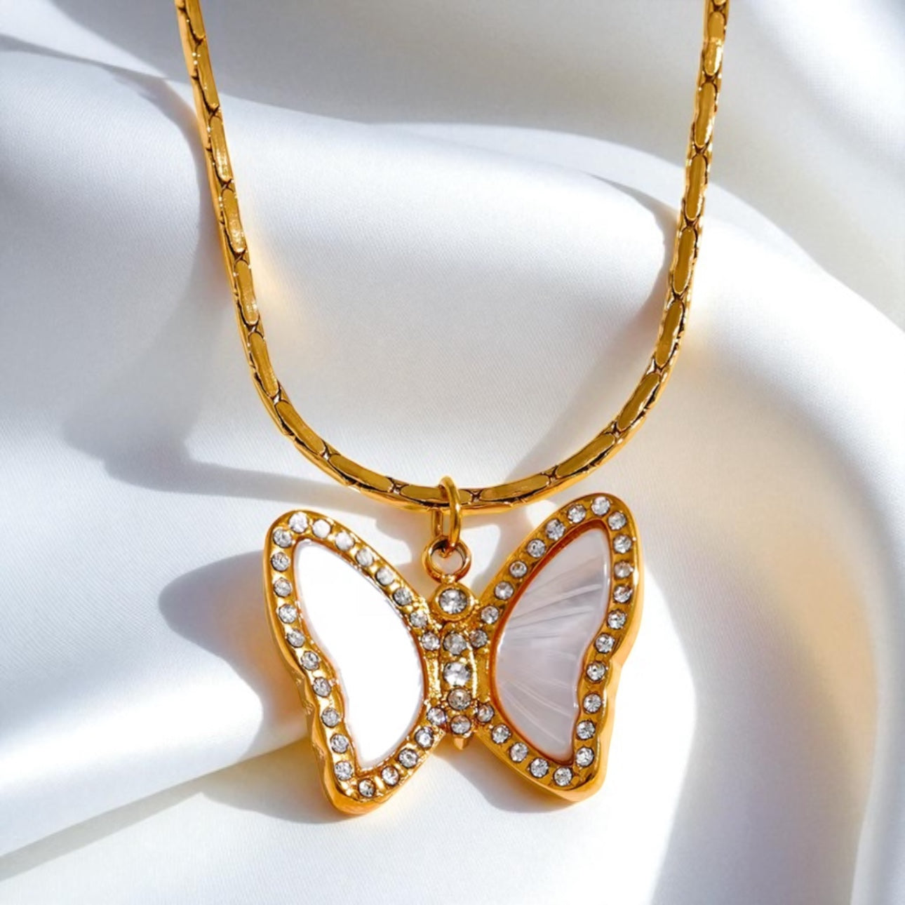 Delicately enchanting and effortlessly elegant, our White Butterfly Shell Necklace captures the beauty of transformation and grace. Adorned with shimmering cubic zirconia accents, this necklace shines with subtle sparkle, perfect for adding a touch of magic to any outfit.